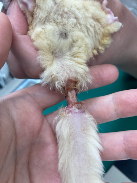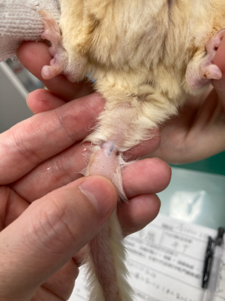 フクロモモンガのキナちゃんは自分でしっぽの一部分を集中的に噛んでしまい、肉がない状態になってしまいました。